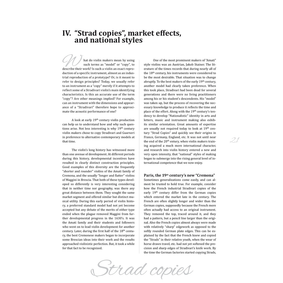 Stradivari died in 1737, within about a decade after his death, the leading makers of not only Cremona, but the world, were gone. It was the end of an era. The Italian violin making centers were caught up with the other great movements of the times, the demise of "Cremona" was like the passage of a season, merely a natural transition to the next stage of existence. If it can be said that after Cremona’s "golden Age", violin making became retroactive in style, it can also be said that optimism and innovation moved further north, and on into France. With the establishment of the Conservatoire, and the concentration of "lutherie" in the city, Paris became Europe’s new violin capital, its new "Cremona".