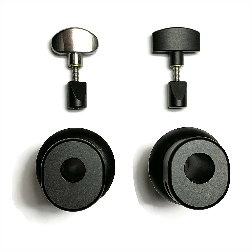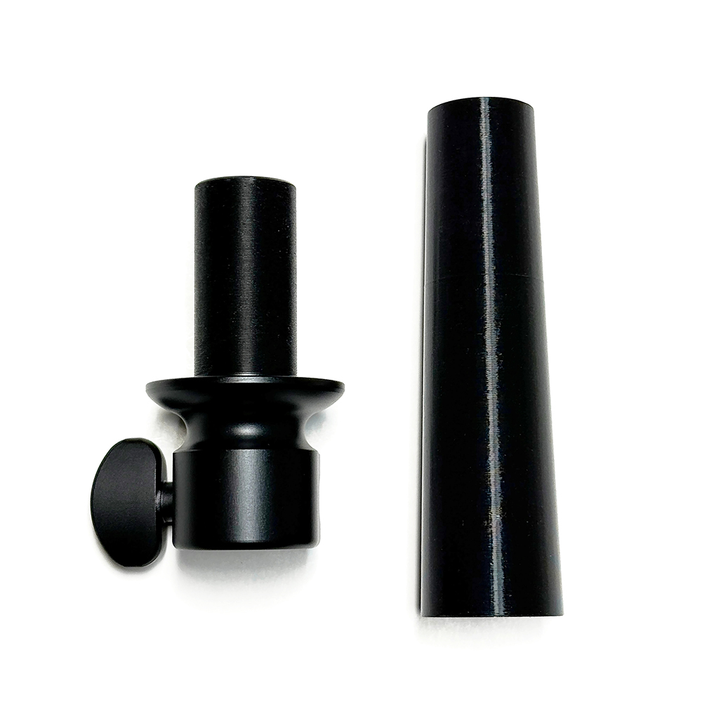 Saddle Rider's trademark aircraft aluminum “Vector Mount” sockets use a wedge-shaped slug instead of a screw or bushing pressing into the endpin. This applies greater holding force with less thumbscrew tightening effort and is extremely effective at preventing the rod from slipping. It is also easy to lubricate and disassemble if switching between Saddle Rider’s various thumbscrew and slug options. Each vector mount ships with a black aircraft aluminum thumbscrew and open-source 3D printed bio-plastic cone that allows a simple, no-reaming required, installation for standard bass and cello sizes.