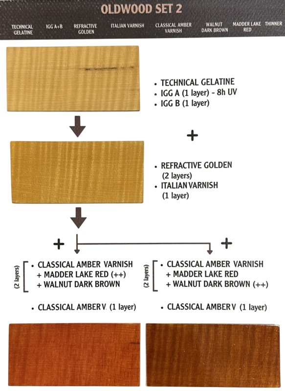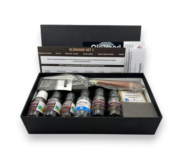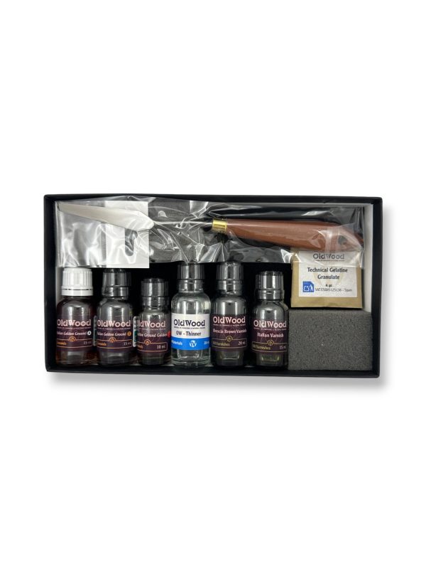The OldWood Set 14102 combines traditional Italian formulas to create a rich finish full of warmth and brilliance. It includes Technical Gelatine, Italian Golden Ground A+B, Refractive Golden, Italian Varnish, Classical Amber Varnish, Walnut Dark Brown Oil Colour, Madder Lake Red Oil Colour, and Thinner, as well as a Painting Knife and an Application Sponge.
